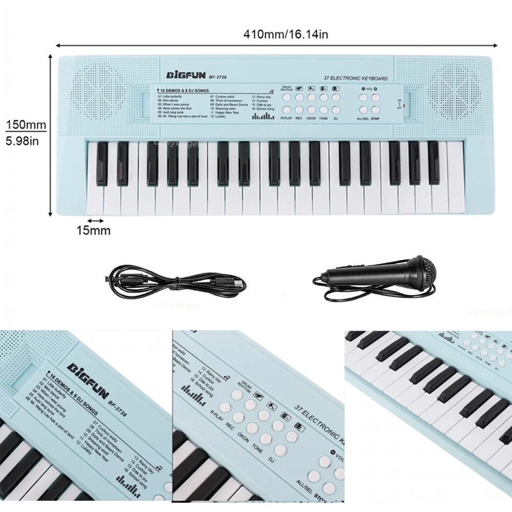 1. The A-37Keys piano: With microphone, this electronic piano keyboard is equipped with a complete 37 key keyboard, built-in 16 demonstration tracks, 8 dynamic songs, speakers and microphone. Children can play and sing to music with a microphone. Cultivate children's musical talent and children's stage performance from an early age.